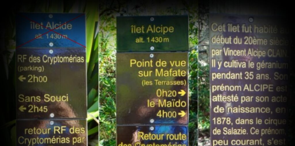 Dans le courant de 1998 à 1999, le petit zenfant Alcipe “René Grimaud” décide d’entreprend la réhabilitions du plateau îlet avec l’association Bois de Nèfles Découverte. Après avoir été restauré, le site est mentionné pendant un certain temps sous le nom alcide au lieu Alcipe, suite à une erreur de prononciation. Entre 2017 et 2020, après avoir été mal prononcé pendant un certain temps, le nom a est rectifié par l’Auteur puis officialisé sous le nom “îlet-Alcipe” dans les dernières heures de l’année 2020, un panneau portant son nom a été installé sur le plateau, par l’Office nationale des forêts officialisant ainsi son appellation sous le nom “îlet-Alcipe“: